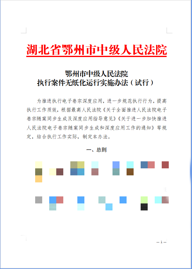 制定《鄂州中院执行案件无纸化运行实施办法》、明确扫描、立案、案卷整理、归档等流程人员分工和职责内容,所有事项在线操作、留痕管理。出台《鄂州中院执行案件单套制归档暂行办法》,明确执行实施案件以单套制归档即电子卷宗为主,纸质卷为辅的归档模式,并实行在线储存和离线储存并行的储存模式,确保数据安全。